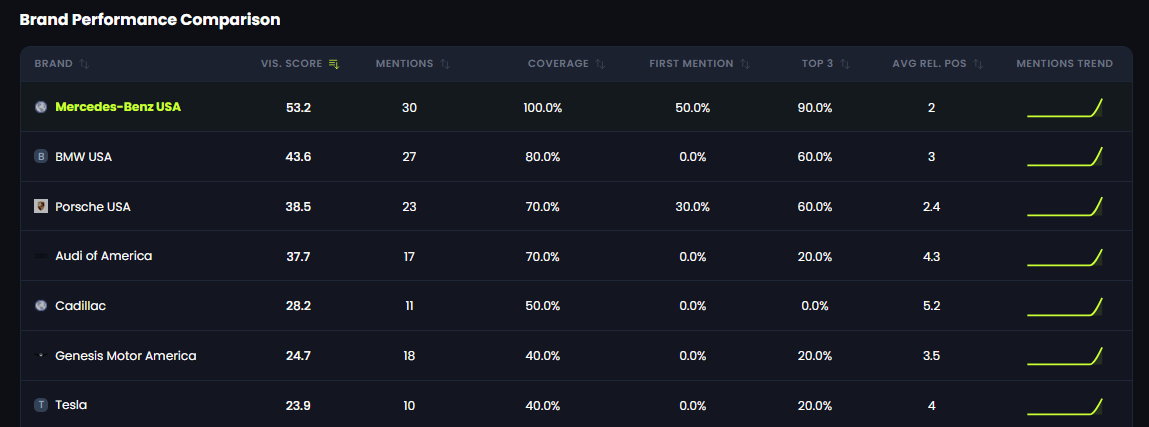 The following snapshot demonstrates how core AI visibility metrics translate into measurable brand positioning.