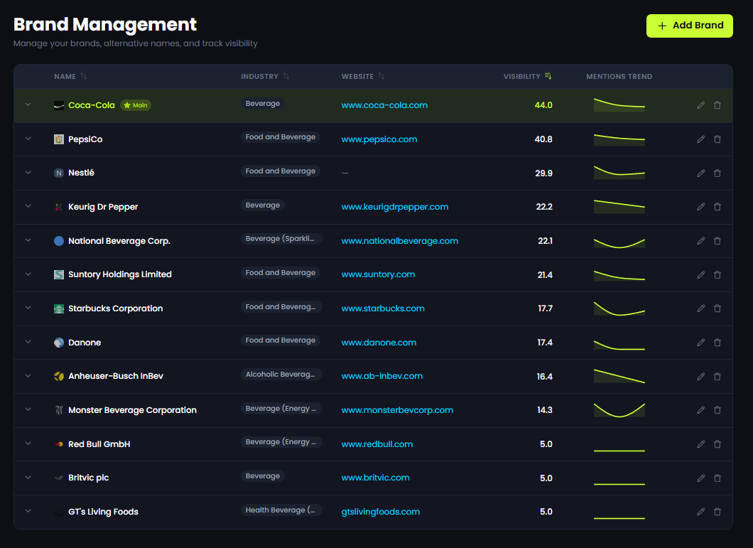 Multi-brand AI visibility benchmarking with structured visibility scoring and trend monitoring.